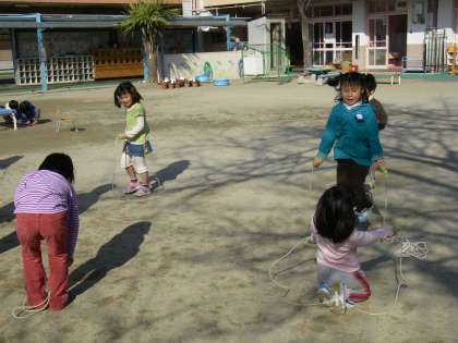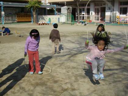 年長さんがなわとびに夢中です。前とび,後とび,片足とび,後あやとび,二重とびなどです。