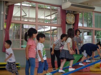 行進したり体操したり,今日は運動会ごっこでスタートしました。各クラスが運動会でどんな遊びや運動をするのか遊んでみました。おばけに見つからないように変身したり,にんじゃの修行をしたり,竹馬でいろいろなコースにチャレンジしたりして遊びました。