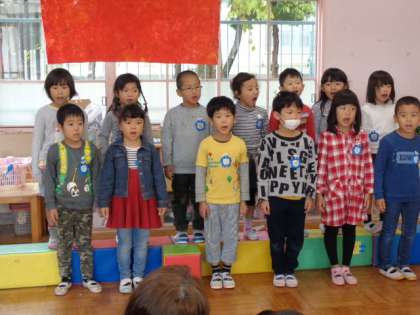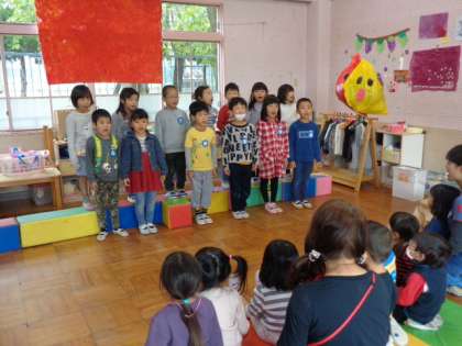 最近,年少の子どもが「カレンダーマーチ」を歌います。それは,年長組さんが幼稚園大会で発表する歌を歌っているのを聞いているからです。今日はお弁当前にそら組さんがひかり組さんに歌の出前をしてくれています。「うまれたまち ふるさと」という歌も大好きのようです。そらさんと一緒に歌っていました。ほのぼのです。