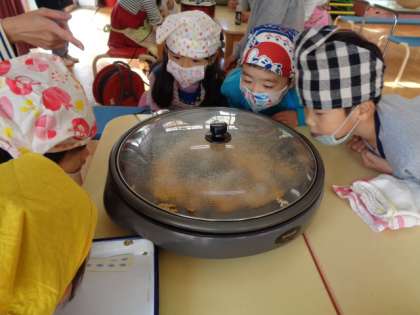 今日はポップコーンパーティ。年長のそら組さんが朝から準備を始めています。6月の花の苗屋さんの時に植えたコーンを使います。今年購入したポップコーンを作る道具と従来のホットプレートでまずは試しています。そら組さんの特権です。子どもたちはじっと見つめています。「まだかなあ」しばらく待っているとポーン。「あっ!できた!」顔を近づけます。ポンポンポンポン,白い花が咲くように。いい香りもしています。ちょっと味見もしてっと。さあ,これから年中さんや年長さんに声をかけて,ポップコーンができるところを見てもらいます。