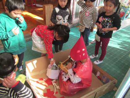 最近、登園時に「あ〜寒い!!」という子どもたちの声が聞こえてきます。すると、5歳児そら組の子どもたちが「寒いと言えば・・・クリスマスやなぁ!」「ほんまや!もうすぐ幼稚園にもサンタさんが来てくれるかもしれないね!!」「ぼく、サンタさんになりたい!」「私はトナカイさんにんりたい!」と言って、早速サンタさんの帽子やひげをつくったり、トナカイさんの角や真っ赤なお鼻をつくったりして遊び始めました。すると「やっぱり、ソリがいる!」と言って段ボール箱をつかってソリをつくりました。完成すると「ひかり組やにじ組に行こう!」と言って出かけて行きました。すると、途中で4歳児にじ組の子どもたちが「サンタさん、トナカイさん!お弁当を食べてください」と言って、巻きずしやケーキを届けてくれました。そして「今からにじ組で演奏会をするからどうぞ〜!!」と言って手作り楽器を使って可愛い演奏を披露してくれました。大満足のサンタさんとトナカイさん!