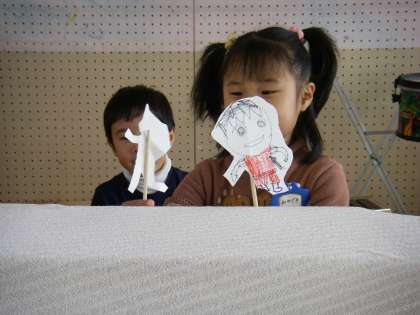 年長さんの女の子です。「人形劇するので,見に来てください」ということで職員が行ってきました。ペープサートを動かしてせりふも合わせて言いました。話に入り込んで演じることで,楽しくてうれしいのです。よい表情です。