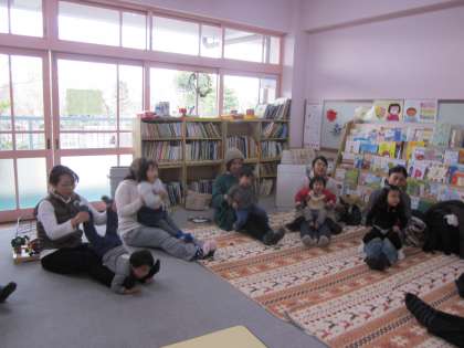 未就園のたんぽぽ組さんに,さくら会の方々に来ていただき,楽しい時間を過ごしました。人形劇や読み聞かせ,手遊びなど30分程度の中で楽しい遊びがいっぱい詰まっていました。お母さんの膝の上に乗って遊ぶこともしました。親子のぬくもりをまた一つ感じることができました。31年度にもまた来ていただくことをお約束いただきました。