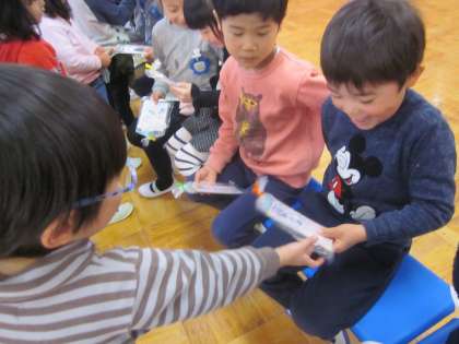 修了式の練習の後,プレゼント交換をしました。年少組さんと年中組さんは今まで,年長さんに見つからないように作ってきました。プレゼントを受け取った年長さんは,満面の笑みで受け取っています。今度は,年長さんからみんなにプレゼントです。遊戯室は,喜びの声でいっぱいになりました。私も教職員も年長さんから,プレゼントをいただきました。かわいい絵の入ったキーホルダーです。余談ですが,毎年,修了式の練習が始まると子どもたちから「園長先生」と呼ばれずに「園長式辞」と呼ばれます。毎年同じことが起こります。子どもたち,ほんまに面白いです。