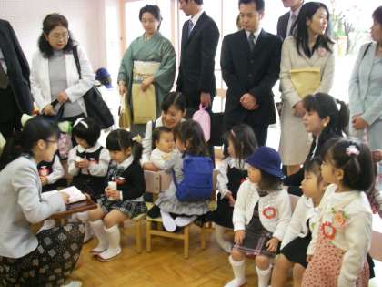 式の後,お部屋に入って担任の先生から紅白のお饅頭をもらいました。