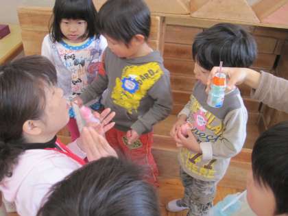 昨日から年長そら組で始まったジュース屋さん。昨日は、「ひかり組みんなにあげるんだ」「次はにじ組さんにあげよう」と、お兄さんお姉さんらしく、一階や園庭に下りて行き、配っていました。嬉しそうに受け取り、本当のジュースのように飲む真似をしてくれる小さい組の姿が嬉しく、もっともっとと、お弁当後もはりきって取り組んでいました。