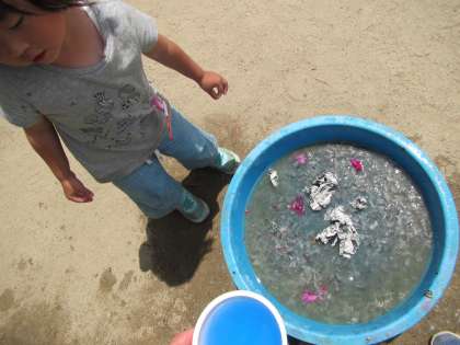 土や水で遊ぶのが大好きなひかり組さん。今日は初めて新聞紙で遊びました。丸めてボールのように投げたり、びりびりに破いたり…。破いた新聞紙をタライに入れ水を加えると、ドロドロ、むにゅむにゅ…何とも言えない感触の粘土が出来上がりました!タライをグルグル混ぜるとドロドロの新聞紙が手やスプーンについてきて、それもまた楽しい様子。Aちゃんは「もっともっと!先生、新聞紙持ってきて!」とさらに新聞紙を入れ、水を入れ、タライいっぱいの新聞紙粘土を作りました。いっぱいになると、またグルグル、ドロドロ…。いっぱい楽しんだ後はみんなで新聞紙をザルですくい、お団子を作ってお片付けをしました。