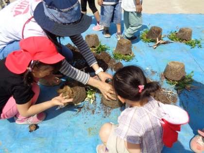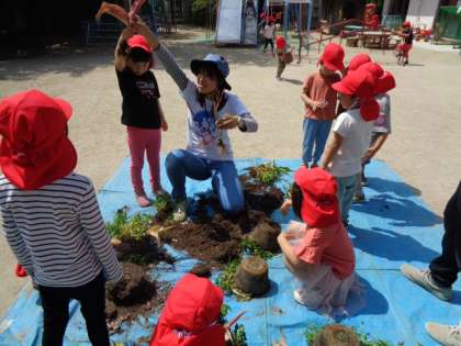 一人一鉢のチューリップ。今日は鉢をあけ,球根を取り出しました。底には細かい根っこがあり,しっかりと土をつかんでいます。「キャー」「どうしたん?」指の先には「なめくじや」「どこどこ,見せて」「こわい!!」「大丈夫,ぼくが守ってあげる」と男の子。
