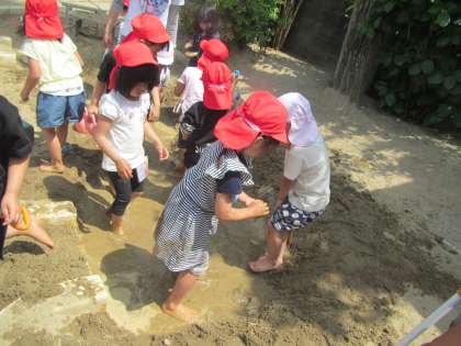 午前中に砂場に穴を掘って,温泉をつくっていたにじ組の子ども達。お昼から水を運び入れ,翔鸞温泉ができました。