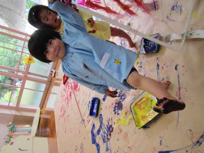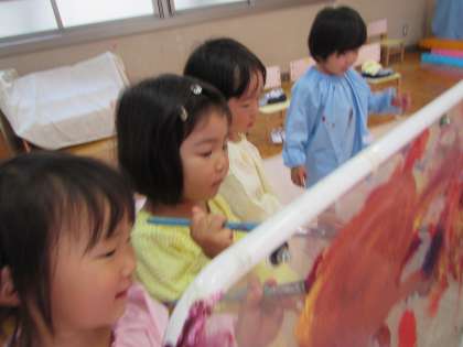 筆や手でクラフト紙にペタペタ、ぬりぬり…。「あ〜!足についた〜!!」紙の上を歩いていたら、自分の足の裏にいっぱい絵具がついていることに気が付きました。先生にぬりぬり、紙にぬりぬり、透明のついたてにぬりぬり、思い思いにぬたくり遊びを楽しみました。