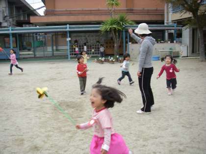 年少組(ひかり組)さんが風車を作って園庭を走っています。みんなで走り回るのが嬉しくて走って風車が回るのも嬉しくて思わず声を出して走り回っているのです。