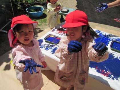 今日はいいお天気だったのでひかり組の子どもたちはえのぐ遊びをしました。とろとろのえのぐを手につけ、「先生、見て!」とAちゃん。Bちゃんは、赤、青、黄色の3つのえのぐをバットの中で混ぜて「こんな色になったよ」。時間が経って、手についた絵の具が乾き、「手がカチカチになってきた」とCちゃんの発見。最後はタライの中で使ったバットと体を洗い、水が気持ちよくて片づけまで楽しめました。