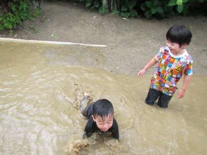 雨が止んだ園庭。砂場には大きな池ができていました。ひかり組のAくんが池の中を歩いていると、足をとられてバッシャーン!と池にダイブしてしまいました!それが楽しかったAくん。そのまま池の中で泳ぎ始めました。そばで見ていたBくんは楽しそうなAくんに引き込まれ、一緒に池の中でパシャパシャ。CちゃんとDくんもそろっと池の中に入っていきました。プールは入れなかったけれど、砂場の池で元気いっぱい遊んで楽しかったね!