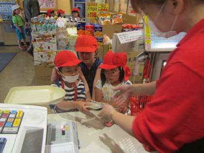 今日は、そら組の子ども達が、明日のカレーパーティーの買物に、ご近所のスーパーに買い物に行ってきました。(そのスーパーは、子ども達が大好きなお店!保育室にもつくって遊んでいましたね!)3つのグループに分かれてカレールー、お肉、ニンジン、リンゴを探して購入しました。(ジャガイモと玉ねぎは翔鸞幼稚園産の物を使います!)「どこにあるのかなぁ?」「あっ、あった!」「他のグループは、もう買ったのかな?」と言いながらお買い物を楽しむ姿が見られました。