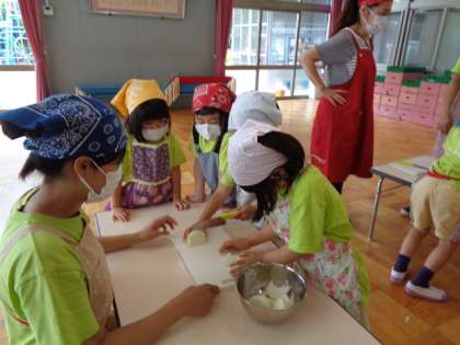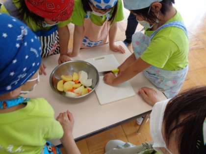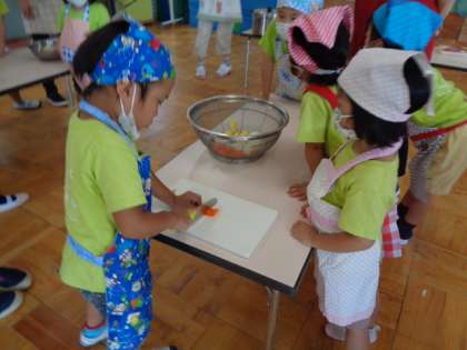 3時になると,カレーの準備を始めました。グループごとに玉ねぎ,にんじん,ジャガイモを切っています。左手をねこの手にして,上手に切っています。かと思えば,魚の頭を落とす時のように,大胆な包丁さばきの子もいます。なんでも経験ですよね。何をしていてもかわいいです。
