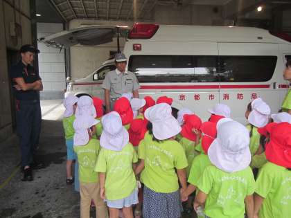 前の日から楽しみにしていた子ども達。救急車の中に乗せてもらったり,防火服を着せてもらったりしました。はしご車のはしごを伸ばすところも見せてもらいました。全部伸ばすと35メートル。はしごに乗ってどんどん遠くなっていく消防士さんを見て「空まで届きそう」と大興奮の子ども達でした。最後には消防音楽隊の方の音楽演奏を聴いて帰ってきました。とっても楽しい消防署遠足でした。