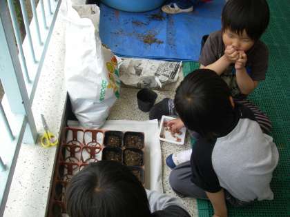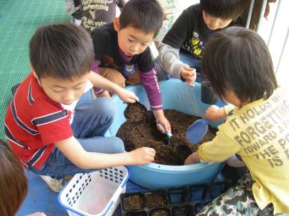 今日は最初の活動,種うえをしました。こちらはかぼちゃグループ,こちらは落花生グループです。「もぐもぐ」もう食べる練習です。