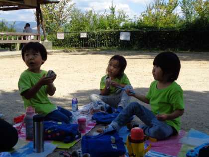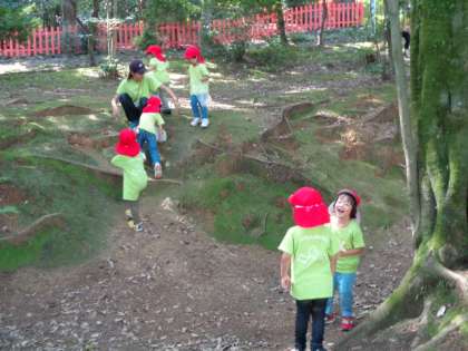 年少のひかり組さんは,船岡山にお出かけしました。秋みつけをしたり,崖になっているところや岩がごつごつしているところを登ったり下りたりして遊んでいました。とても楽しかったようで何度も何度も繰り返してチャレンジしていました。石舞台ではコンサートを始めて,パプリカを踊ってくれました。行きも帰りもしっかり歩くし,バスに乗っても「座りたい」ともいわず,ほかの乗客のおばあさんとの会話を楽しんでいました。なんかみんな大きくなってきたなあ。感心しました。