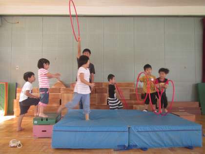 フラフープをくぐってジャンプです。そんな子どもの姿を見て,これは面白いと思い,分厚いマットを敷いてそこにジャンプできるようにしました。すると,たくさんの子ども達が集まってきてジャンプし始めました。ぶつからないようにフラフープの下を転がる子どももいます。「赤いフープで燃えてるってことにしよう!」とぶつからないようにジャンプしてくぐります。でも,ぶつかってしまっても大丈夫。そんな時は,急いで青色のフープで冷やします。子ども達の発想ってとっても面白いです。