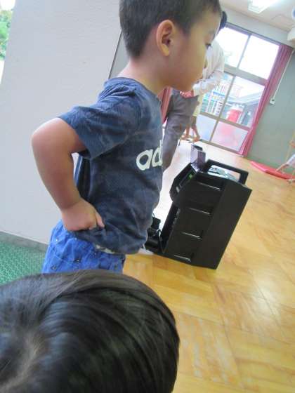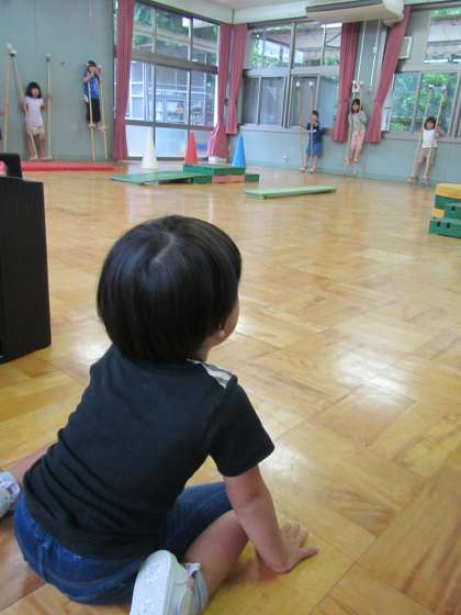 真剣な眼差しで、身を乗り出して、ひかり組のAくん、Bちゃんは何かを見ています。「ジャンプしはったな」「高いなあ」。2人の視線の先は、竹馬で色々なコースに挑戦している年長のそら組さんです。「すごいな、そら組さん。」というと、大きくうなずくAくん。「すごいな」という憧れの気持ちが積もって積もって、年長になった時の「やってみたい」につながっていくのだと感じました。