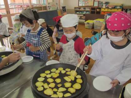 今日は幼稚園で収穫したサツマイモを使って、おいもパーティーをしました。薄切りにしたサツマイモをホットプレートで焼くのは、そら組の子ども達でした。「パーティーだから、楽しいことしたいなぁ・・・」「何する?」「そうや!ダンスショーとか見てもらおう!」「ドングリスライダーもさせてあげたい!」などなど、子ども達なりに色々な「お・も・て・な・し!」を考えていました。
