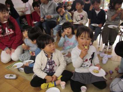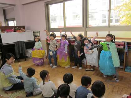 いい感じにサツマイモが焼けると、「おいもパーティーチケットを配りに行ってくる!」と言って、ひかり組とにじ組の友達を誘いに行きました。さぁ、そら組の部屋は大賑わい!!虹小学校3年生の子ども達による(学校ごっこの中に登場する子ども達)ダンスショーを見てもらってから、お芋を食べてもらいました。その後は、ドングリスライダーをいっぱい楽しんでもらいました。
