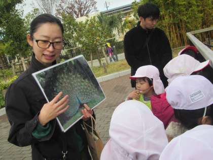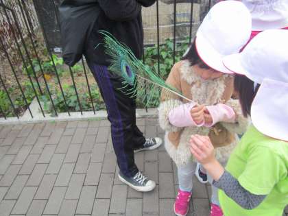 今日は、京都市動物園に園外保育に出かけました。5歳児そら組の子どもたちは前日に動物クイズをしていた時に、クジャクにとても興味をもちました。1「クジャクの羽はどうしてあんなに綺麗なの?」2「クジャクは何を食べるの?」3「クジャクは何をして遊ぶのが好き?」などなど・・・。気になることがいっぱい!当日、クジャクを見ていると子ども達の目の前にクジャク博士が来てくれました。そして、クジャクの謎について色々なお話を聞かせてくださいました。そして・・・本物のクジャクの羽や卵を触らせていただきました!!キラキラ輝くクジャクの羽はとても素敵でした!