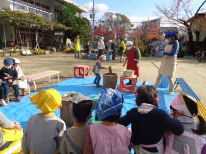 毎年恒例のお餅つき。少年補導の皆さんや保護者の方にお手伝いいただき,餅つきが始まりました。一人ずつお餅つきをしました。「おいしくなあれ」の掛け声。ペッタンペッタン。その後は,丸めました。そして今日のお昼ご飯は,きな粉と砂糖醤油のお餅です。おかわりもどんどんしています。いろいろな人たちの協力をいただき,無事おいしくいただきました。