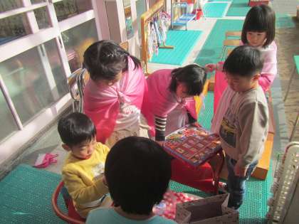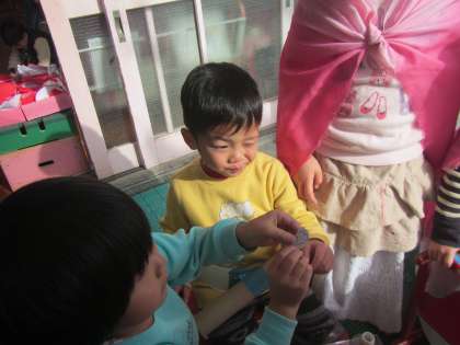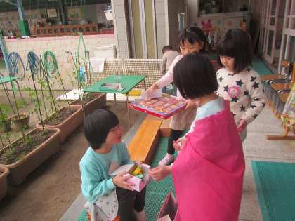 今日,にじ組ジュース屋さんがオープンしました。「ひかり組さんに来てほしい!」と言ってチケットをつくって配りに行く子ども達。「もうすぐ来はるかも!」とお店の中を綺麗に掃除したり「はくちゃんもお店の中で一緒にいれるってことにしよう!」とうさぎのはくちゃんをお店につれてきたり・・・ひかり組さんを楽しみにまつ子ども達。さっそく,ひかり組さんが来てくれました。ジュース屋さんのお店の中に入ると,まずは,くじ引をひきます(数字が書いてある紙)。その数字を見せると,お菓子がもらえます(アドベントカレンダーの空き箱の中に,にじ組の子どもお手製のお菓子が入っていて,くじをひいた数字と同じ数字の所に入っているお菓子がもらえる)。おまけに,ドーナツももらえるというスペシャルなジュース屋さんです。