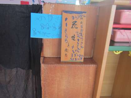 お薬研究所きららには,表札もあります。木箱の蓋を見て「いいもの見つけた!」「これ研究所につけよう!」とAちゃん。元から書いてあった字が表札みたいに見えたようでした。子どものアイデアって本当におもしろいです。