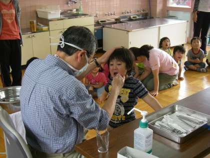 今日は午後から幼稚園で歯科検診がありました。園医の歯科医先生に見てもらいました。「C1C2・・・」口を大きく開けて診てもらいました。診てもらう前は不安そうですが,診てもらった後は表情一変。リラックス顔です。