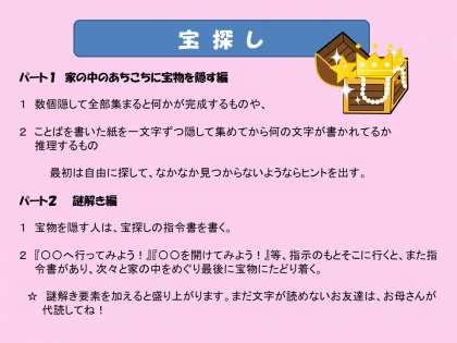 今日はお家で「宝探しゲーム」という楽しい遊びを投稿してくださったので紹介します!色々な物を宝物にして遊んでみてね!