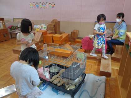 午前中は,にじ組さんが登園してくれました。男子1人,女子5人。お部屋の中で女子5人は,いろいろとごっこ遊びをしていました。キッチンを使ったり,積み木を使ったりして,久しぶりのお友達と楽しく過ごしました。遊戯室でも功技台を使って遊んでいました。男子1人は,なかよし広場の男子や先生たちと遊びました。