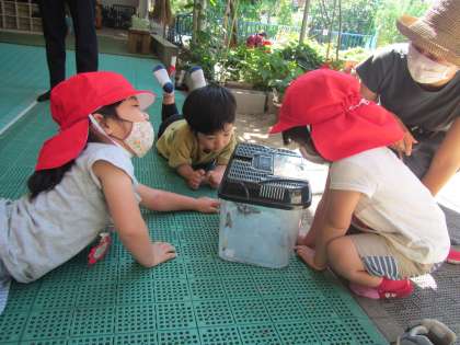 今朝,3歳児ひかり組の部屋では,とてもうれしいことがありました!なんと,サナギが,とてもきれいなアゲハチョウに変身していたのです! 子どもたちも,お家の人たちも「すごーい!」と言って,飼育ケースをのぞいていました。すると「お花を入れてあげなくちゃ!」とAちゃん。ケースの中に,お花を入れると,アゲハチョウも羽をピンと伸ばして,嬉しそうにとまっていましたね!