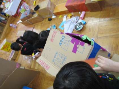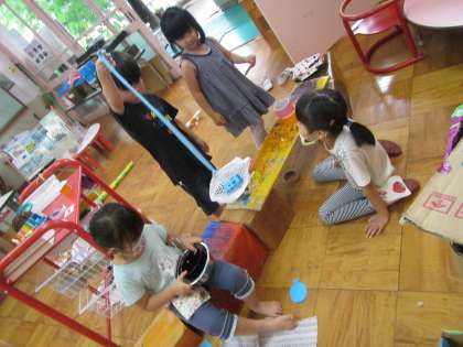 今日は船の上で魚釣りをしていたにじ組さんです。魚を釣るのが楽しい子ども,魚を動かすのが楽しい子ども,魚やタコなど海の生き物をつくる子ども…楽しみ方はいろいろでした。保育室に帰ってきたお友達にも,釣った魚をおすそ分けしました。その後みんなで船に乗り,海に出ました。「あ!あんなところに海賊がいます!」戦いに行くAくん。「おなかがすいたら,こっそり食べちゃおう〜!」とこっそりお魚をおなかに抱えて船に乗っていたお友達もいましたよ!