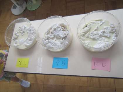 ”そら組たまねぎ大作戦”に向けて,Tシャツをたんぱく質染めしました。(Tシャツにたんぱく質をつけておくと,たまねぎの色がきれいにTシャツに入るみたいです。)豆乳と水を1:1で混ぜ合せ,絞って干して,たんぱく染めの完成です。来週のたまねぎ染めの日を楽しみに,子ども達とTシャツを干しました。たまねぎの皮もご協力いただきありがとうございます。たくさんの皮が集まり,みなさまのご協力の元,無事に玉ねぎ染めの日を迎えることができそうです。