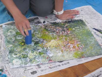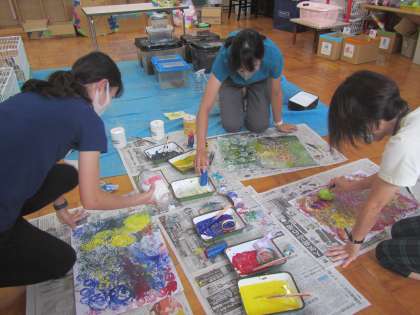 今日は,先生たちで絵具遊びの研修会をしました。「どんな道具を使って絵具遊びをしたら楽しいかな?」と,色々な材料を使って,絵具遊びに使う道具をつくったり,「どんな色になるのかなぁ」と,つくった物を使って,試したり・・・。2学期になったら,子ども達と一緒に遊んでみたいです!お楽しみに!!