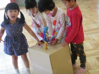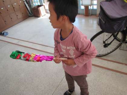 そら組さんがつくったトーチを見て,「かっこいい!」「ぼくもあれをつくりたい」と子どもたち。テープや材料を分けてもらって,にじ組の子どもたちも世界に1つだけのトーチをつくりました。トーチが出来上がると,いつも自分たちが見ているように,トーチを高く上げて走り,聖火を集めます。憧れのそら組さんに「かっこいいね!」と褒めてもらってとっても満足そうな子どもたちでした。