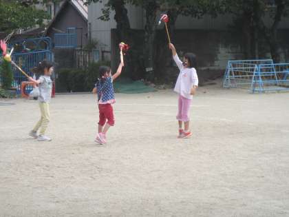 毎朝,登園すると,自分のトーチをカスタマイズしています。バーのように動くものをつけて,火の調節ができるようにしたり,聖火がつく場所を3か所にしたりしています。今日の午後,なにやらチケットをつくっている子ども達がいました。「聖火のショーをする」とのこと。園庭で曲に合わせて,踊ったり走ったり・・・。聖火のトーチをもって,オリンピック選手とアイドルの競演です。