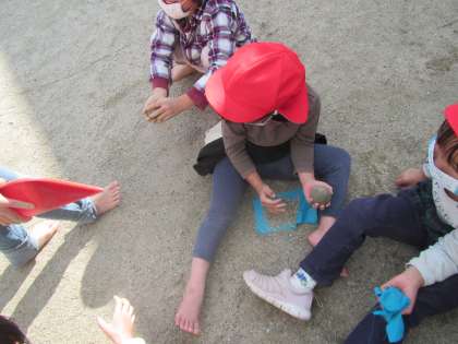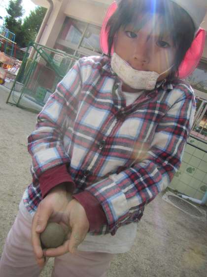 友達の姿を見て,「ピカピカだんごをつくりたい!」と思う姿がにじ組で増えてきています。「私,泥だんご名人だから何でも聞いてね」とAちゃん。「濡れてる時は,こすったらあかん」「サラ粉をたくさんつける!」と教えてくれました。今日初めてピカピカだんごづくりに挑戦したBちゃん。最初が難しい…。でも,お友達に教えてもらったり自分で何回も試したりしているうちに,初めて固いだんごをつくることができました。ちょっと難しくて,根気も必要ですが,「やってみたい!」という思いで頑張っています。