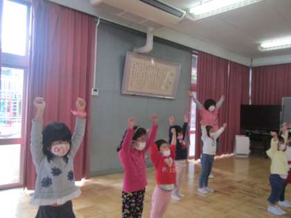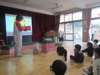 今日は,ミツオさんが来て下さいました。ピーマン村体操を執筆された則武光男さんです。ふれあい遊びや絵本の読聞かせをしていただき楽しい時間を過ごしました。『さつまのおいも』の絵本を読聞かせしてもらったり,かみなりどんがやってきたの手遊びをしたり・・・。45分の時間があっという間でした。保育室に戻った後「またきてほしい!」と子ども達もとっても楽しかったみたいでした。かみなりどんがやってきたの手遊びでは,言われた身体の場所を隠し,隠せたら「セーフ!イエスッ!」と言います。それが楽しいのです。お弁当前に「クイズ!私の好きな食べ物は何でしょう?」「いちご!」「セーフ!イエスッ!」と言い合う子ども達の姿が見られました。”セーフ!イエス!”ブームが訪れそうな予感です・・・。楽しかったね!ミツオさん,ありがとうございました。