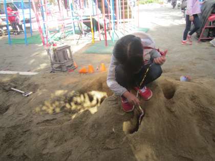 穴掘り探検隊の子ども達は,朝から暗い所を照らす懐中電灯や,火が噴きだした時につかう消火器などをつくっていました。完成すると車に乗って出発です。穴を掘っていると白い石が出てきました。「怪しい!」「これは怪しい・・・。」「化石かも!」「歯かも!?」「これは,この世で一番古い葉っぱやな。」と土の中から色々なものがでてきました。砂の中の音が聞こえる道具で奥の方の音も聞いてみました。穴掘って疲れてきたら,パワーがでたり腕の力がアップしたりする赤い実の入ったお団子をぱくり。今日もたくさん掘りました。