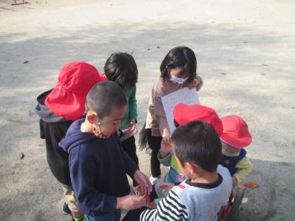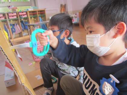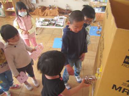 今日そらぐみの子ども達は,チラシとお金をつくって”がちゃがちゃおもちゃ屋さん”の宣伝に行きました。するとひかり組さんが来てくれました。1人2人・・・どんどん来てくれて,がちゃがちゃおもちゃ屋さんは大盛況。お客さんが来てくれると嬉しくて,そら組の子ども達も張り切ります。おもちゃもお金もなくなると「ちょっと一回閉店しよう!」と閉店し,ガチャガチャの改装が始まりました。明日もお客さん来てくれるかな?