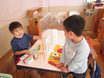 昨日,泥棒のおうちをつくって,「大泥棒を捕まえるぞ!」と出かけて行ったにじ組の子どもたち。「私たちは,妖精になって一緒に行くわ。」とお友達。今日,妖精の家もつくろうということになり,妖精さんのおうちも出来上がりました。お弁当は,それぞれのおうちの中で食べることにしました。可愛い妖精のおうちと,道具や仕掛けがたくさんの泥棒のおうち。どちらも子どもたちのお気に入りです。