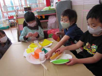 家に設置してある双眼鏡をのぞき,「きょうりゅうがいる!」とにじ組のどろぼうたち。今日は,”きょうりゅうの卵”を,盗みに行き,卵焼きにして食べよう!ということになりました。自分の武器を持って出かけ,しばらくして「卵あった?」と聞くと,「あった!」と大きな卵を抱え(る仕草をし)ながらどろぼうのAくんが帰ってきました。その卵を剣を使って割り,卵焼き,目玉焼き,春巻き,茶わん蒸しなど,色々な料理をつくってくれ,最後にどろぼうたちも妖精たちも,みんな一緒に卵パーティーをしました。大きな卵だったので,みんなおなかいっぱいになりました。