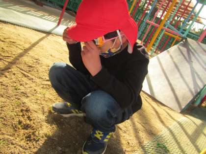 幼稚園の隣の公園で工事をしていました。大きな黒い土の山ができる様子を見ていると「あっ,あの黒い山に氷鬼がいたぞ!」「えっ?ほんま?」「ほんまやー!!」と,大騒ぎのひかり組の子ども達。そして,その後,氷鬼をやっつけるために,魔法のスティックにお日様の光のパワーを集めたり,何でも見える眼鏡を装着して,氷鬼探したり・・・!氷鬼を見つけるために,妖精とヒーローマンたちは今日も大活躍でした!