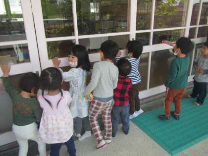 ひかり組の子ども達が,部屋の前でパーティーごっこをして遊んでいたら,にじ組のお兄さん,お姉さんたちが不思議な物を手に持って遊びに来てくれました。すると,「今から,おばけ探検に行って,おばけ退治しにいくねん。ひかり組さんも一緒に行こう!」と誘ってくれました。ひかり組の子ども達にとって,初めて聞く「おばけ探検」の言葉に,なんだかワクワク・・・!一緒について行くことにしました。「あそこの部屋の中に,白いおばけがいるねん!」「どこ?どこ?」「この望遠鏡で見たら,よーく見えるよ」「ほら,この機械で吸い取った!」などなど。目をキラキラ輝かせながら,初おばけ探検を楽しむ,3歳児ひかり組の子ども達でした!