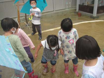 今日は,朝から雨。遊戯室で体を動かして遊んでいました。ジャンプしたり,一本橋を渡ったり・・・。そうして遊んでいると何から発見したAくんが,窓の方へ走っていき「すご〜!海だ〜!」と言いました。みんなもやってきて「おっきい!」「こっちに来てもいいですよ〜!」と言いながら遊んでいました。雨が止むと長靴を履き,園庭へ遊びにいきました。もちろん向かった先は砂場です。長靴を履きながら,そーっと足を入れ「ここふかーい!」「穴掘ってたとこやな!」と楽しそうです。いつしか足をバシャバシャ,思いっきりジャンプ!遊び終わって長靴を脱ぎ,ひっくり返すと,じゃーっと水がでてきました。「あ〜,楽しかった!」「着替えよ〜!」と雨上がりを満喫したにじ組の子ども達でした。