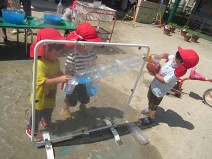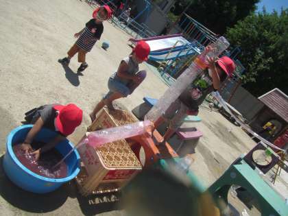 色水遊びが,とても楽しい今日この頃。遊びの中で,だんだん色が変わっていくことに興味をもち始めた子ども達にとって,どんな遊びの場があると,もっとおもしろくなるのかなぁ・・・と考え,透明のペットボトルを色々な方向につないで「色水スライダー」で遊べる場を設けてみました。自分の色水を入れた後に,友達が色水を入れると,出てくる色は,あらまぁ不思議!!別の色になって出てくるではありませんか!!何度も,何度も繰り返しながら遊ぶ子どもたちの姿が見られました!