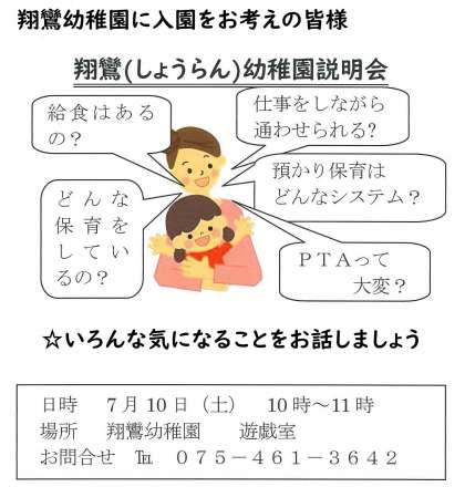 7月10日(土)10時より翔鸞幼稚園 幼稚園説明会を行います。未就園のお子様で入園を考えておられる場合は是非ともご参加ください。